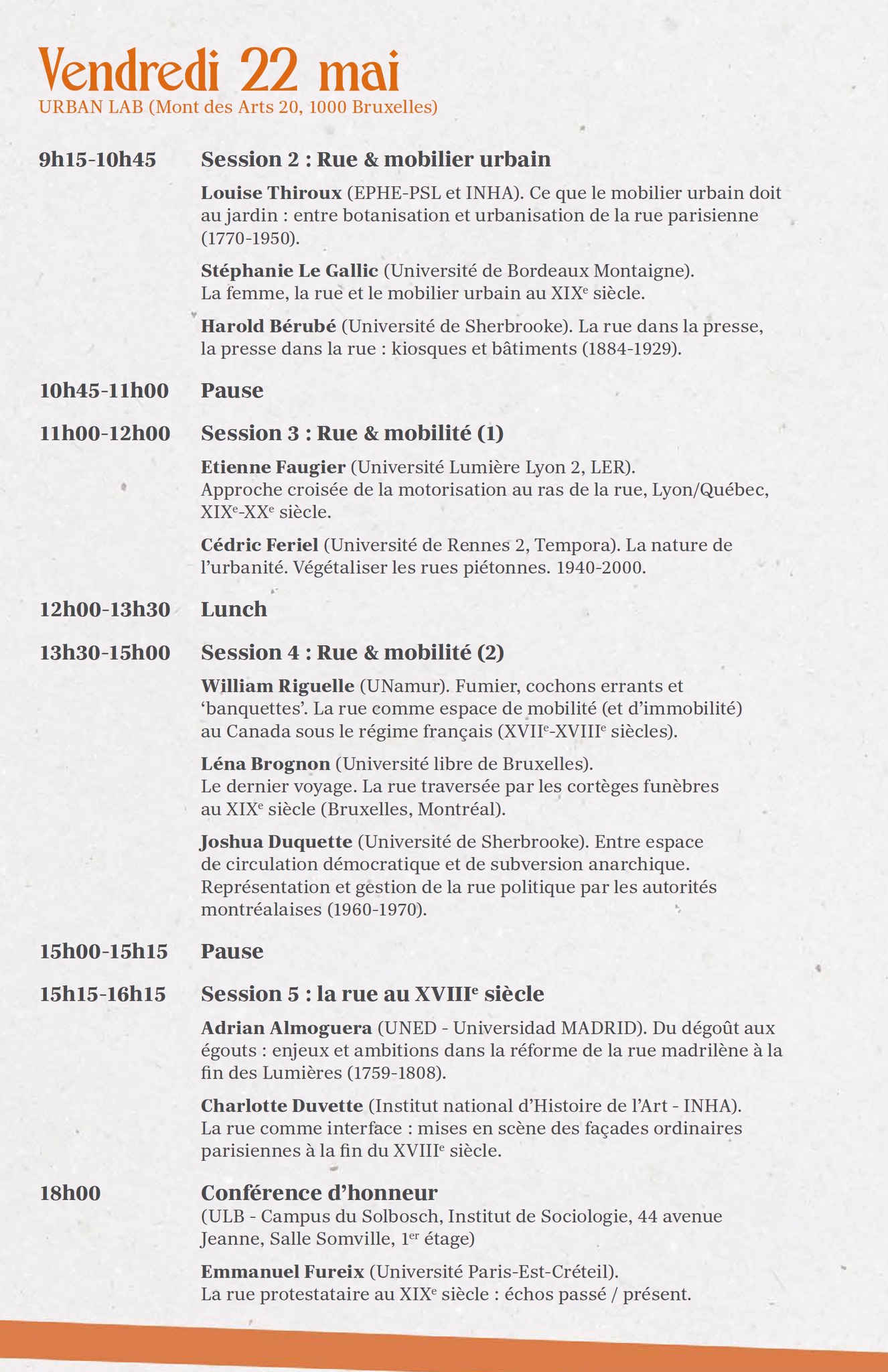 Materialities, Uses, and Representations (Americas-Europe, 17th-20th Century)Launched in 2023 and based at the University of Sherbrooke and the Université libre de Bruxelles, the inter-university research collective Streetstories | Histoires de rue brings together researchers interested in the street as a historical object. This collective follows on from foundational syntheses (Tartakowsky, 2022), methodological works (Van den Heuvel, 2023), and case studies (Horner, 2020; Feriel, 2022; Ross, 2022).